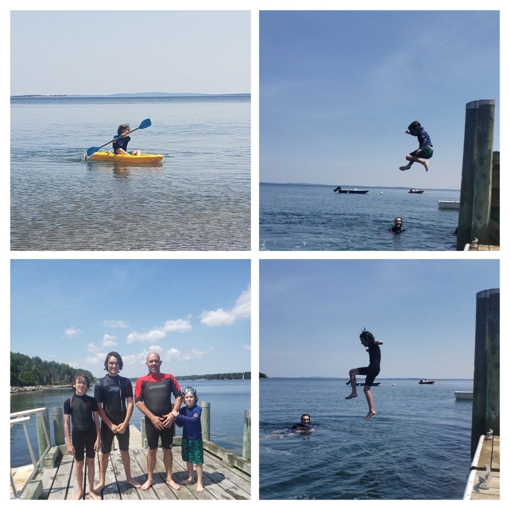 I continued to have many hours when exhaustion overwhelmed me, and I had to sleep, despite not wanting to miss a moment with them. The happy shouts of the boys jumping off the dock or falling off the kayaks into the frigid ocean waters was the most soothing background music I could imagine. I cry whenever I think about their departure tomorrow. A week isn’t long enough, and I hope my daughter’s promise to stay for at least two or three weeks next summer is realized. There is also talk of a visit at Christmas, but I know that’s not a great time to travel.